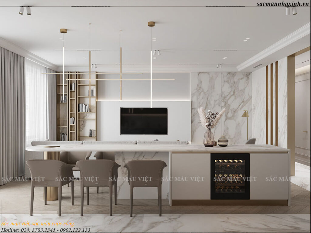 Phòng bếp là một không gian nối liền giữa quầy nấu bếp và bàn ăn được bố trí rất chỉn chu và ngăn nắp. Bàn ăn kết hợp khu quầy bar với 1 tông màu trắng bày biện đẹp mắt, tinh tế. Bên cạnh đó là khu tủ rượu được bố trí ngay cạnh trông vô cùng đẹp mắt và hài hòa