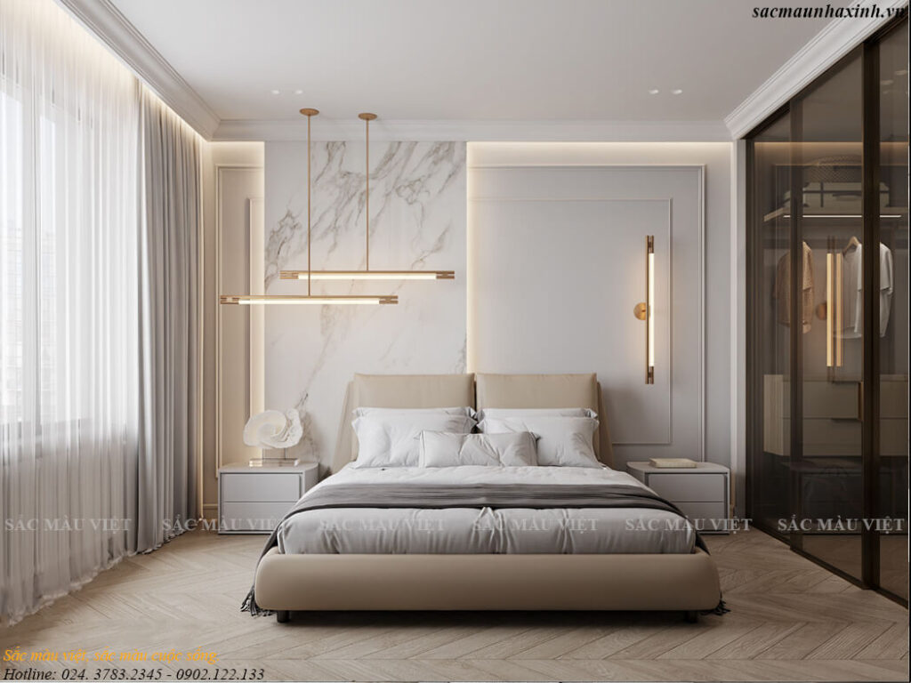 Màu kem dịu dàng của ga nệm kết hợp điệu nghệ cùng màu sắc của chăn và gối gợi lên một không gian thật thư thái. Mảng tường đầu giường ngủ ốp vách trang trí kết hợp phào chỉ tường đã tạo điểm nhấn tinh tế giúp cho thiết kế nội thất của phòng ngủ thêm thời thượng. Hai bên giường là 2 tab để đồ đối xứng, vừa tạo nét đặc trưng trong phong cách tân cổ điển, vừa có nét hiện đại phá cách. Phòng ngủ cũng có cửa kính lớn và rèm che để có ánh sáng từ tự nhiên.