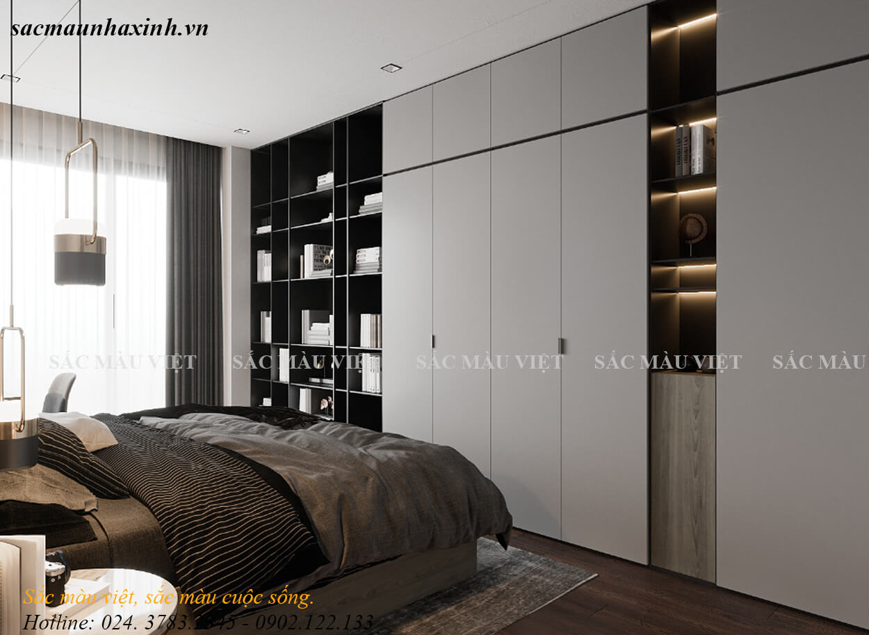 Phòng ngủ 1 sử dụng gam màu be xám làm chủ đạo kết hợp cùng chút màu trầm từ vỏ ga, gối và thảm trải nhà tạo nên sự sang trọng đồng thời cũng là những tone màu giúp giấc ngủ được sâu hơn. Hệ tủ trưng bày kết hợp tủ để đồ là ưu tiên số 1 cho những căn hộ vừa và nhỏ, vừa tạo tiện ích, vừa tối ưu công năng